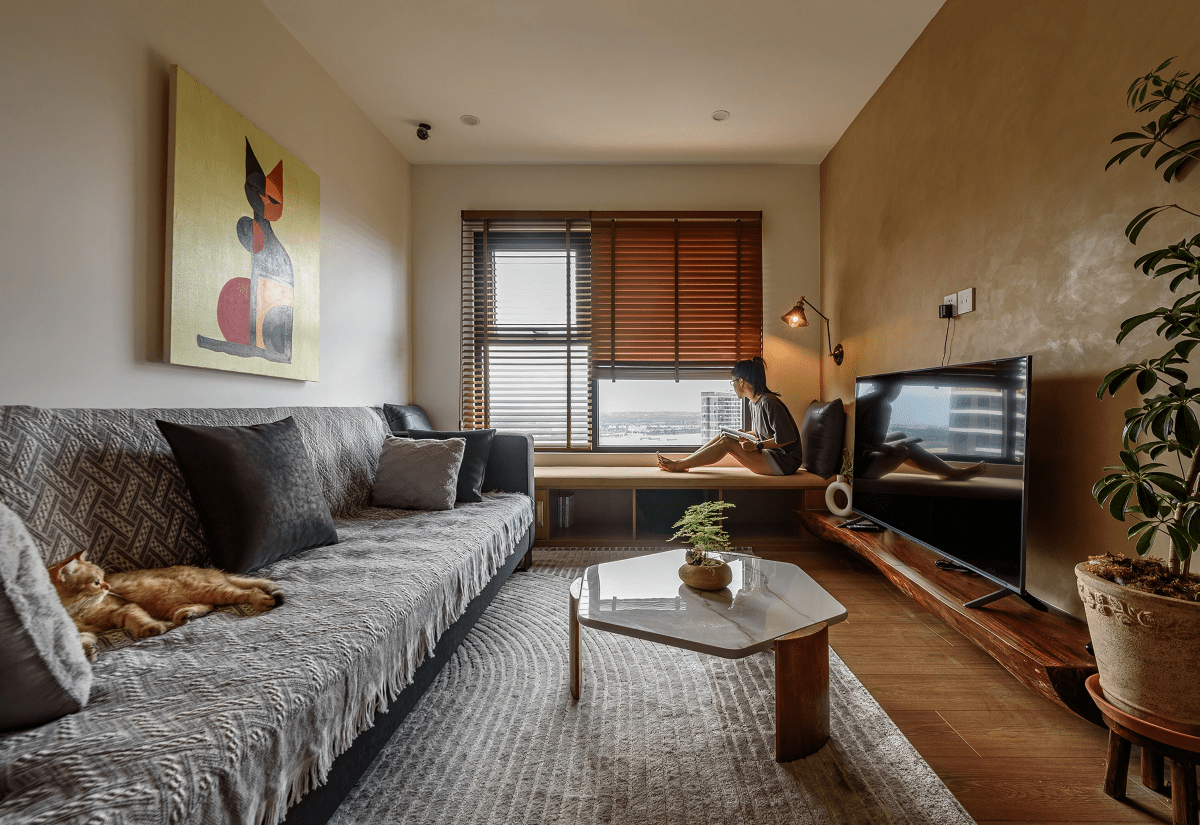 Phòng khách không có ban công, do đó KTS đã tận dụng góc cửa sổ để bố trí bench ngồi - phù hợp làm góc đọc sách và ngắm sông phía dưới.